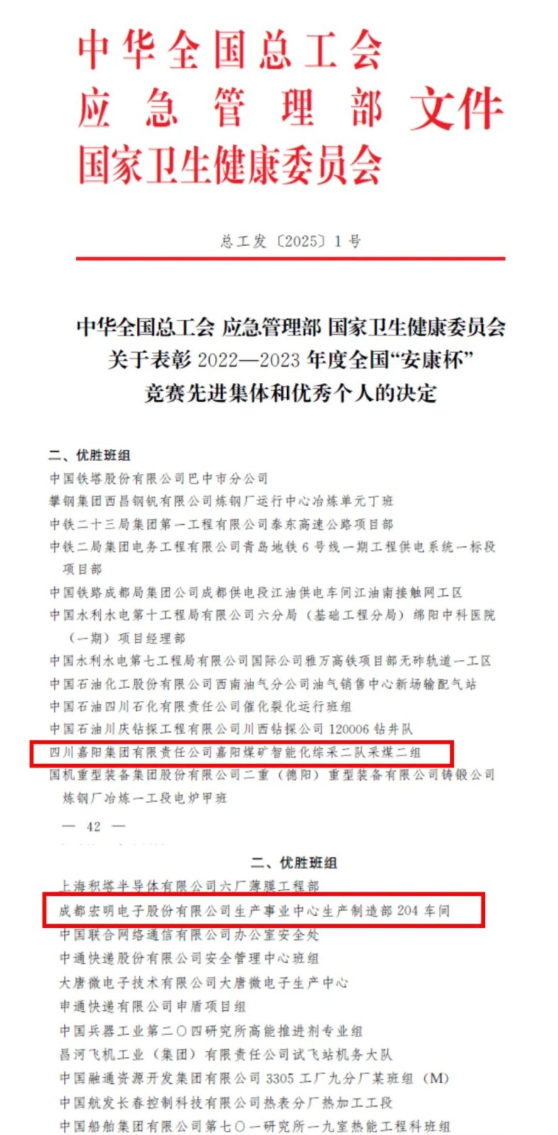 近日,中華全國總工會、應(yīng)急管理部、國家衛(wèi)生健康委員會聯(lián)合發(fā)布了《關(guān)于表彰2022-2023年度全國“安康杯”競賽先進(jìn)集體和優(yōu)秀個人的決定》,川投集團(tuán)所屬嘉陽集團(tuán)嘉陽煤礦智能化綜采二隊采煤二組和川投信產(chǎn)宏明電子生產(chǎn)事業(yè)中心生產(chǎn)制造部204車間榜上有名,分別獲評全國“安康杯”競賽優(yōu)勝班組。