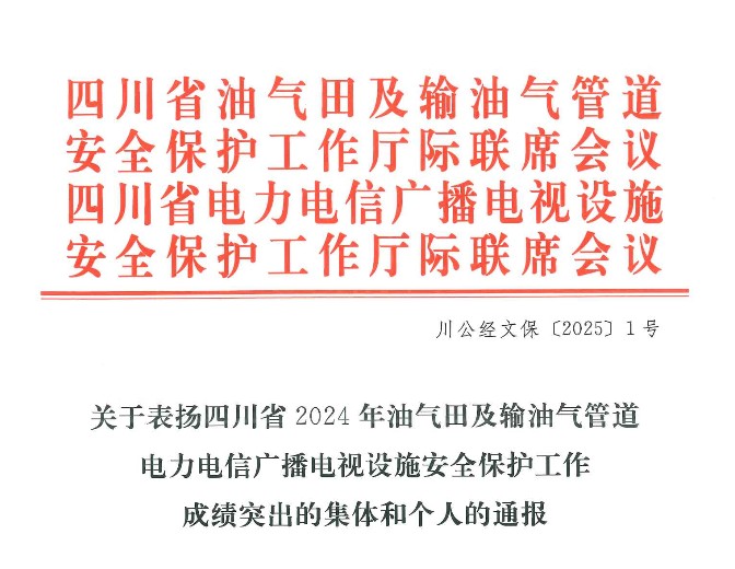近日,四川省電力電信廣播電視設(shè)施安全保護(hù)工作廳際聯(lián)席會(huì)議通報(bào)表彰了四川省2024年油氣田及輸油氣管道、電力電信廣播電視設(shè)施安全保護(hù)工作成績突出集體和個(gè)人。集團(tuán)公司將評(píng)選對(duì)象重點(diǎn)向基層一線單位和個(gè)人傾斜,積極開展擇優(yōu)評(píng)選推薦上報(bào)工作,川投集團(tuán)所屬達(dá)州氣電公司榮獲“成績突出集體”,川投電力公司總經(jīng)理蔡承德榮獲“成績突出個(gè)人”。