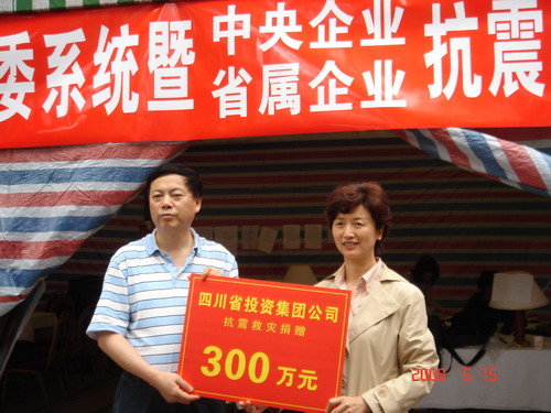 2008年5月15日上午9:30分,川投集團(tuán)積極響應(yīng)省國資委關(guān)于開展抗震救災(zāi)捐贈活動的號召,發(fā)揚(yáng)“一方有難,八方支援”的精神,認(rèn)真履行社會責(zé)任,在接到通知后快速行動起來,由總會計(jì)師曹筱萍帶隊(duì),在省國資委抗震救災(zāi)指揮部內(nèi),向四川省慈善總會無私捐出人民幣300萬元,代表16000名川投人的無私愛心,將有力支援災(zāi)區(qū)人民重建家園。(川投集團(tuán)抗震救災(zāi)領(lǐng)導(dǎo)小組辦公室整理)
