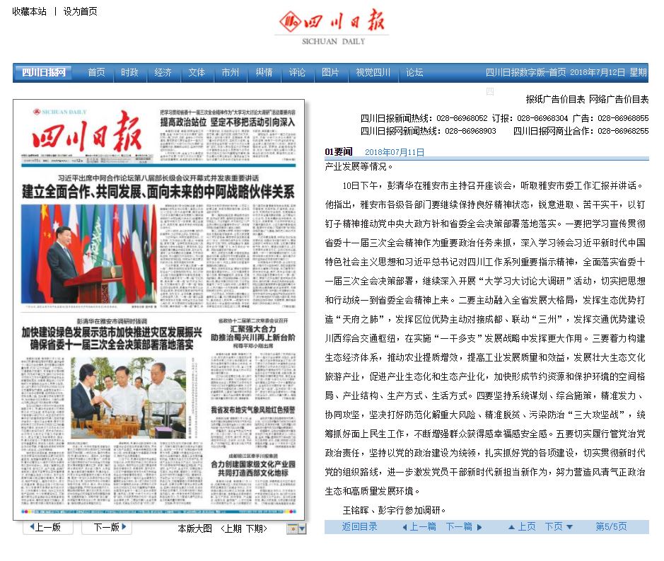 彭清華在雅安市調(diào)研時強調(diào)加快建設(shè)綠色發(fā)展示范市加快推進災(zāi)區(qū)發(fā)展振興 確保省委十一屆三次全會決策部署落地落實