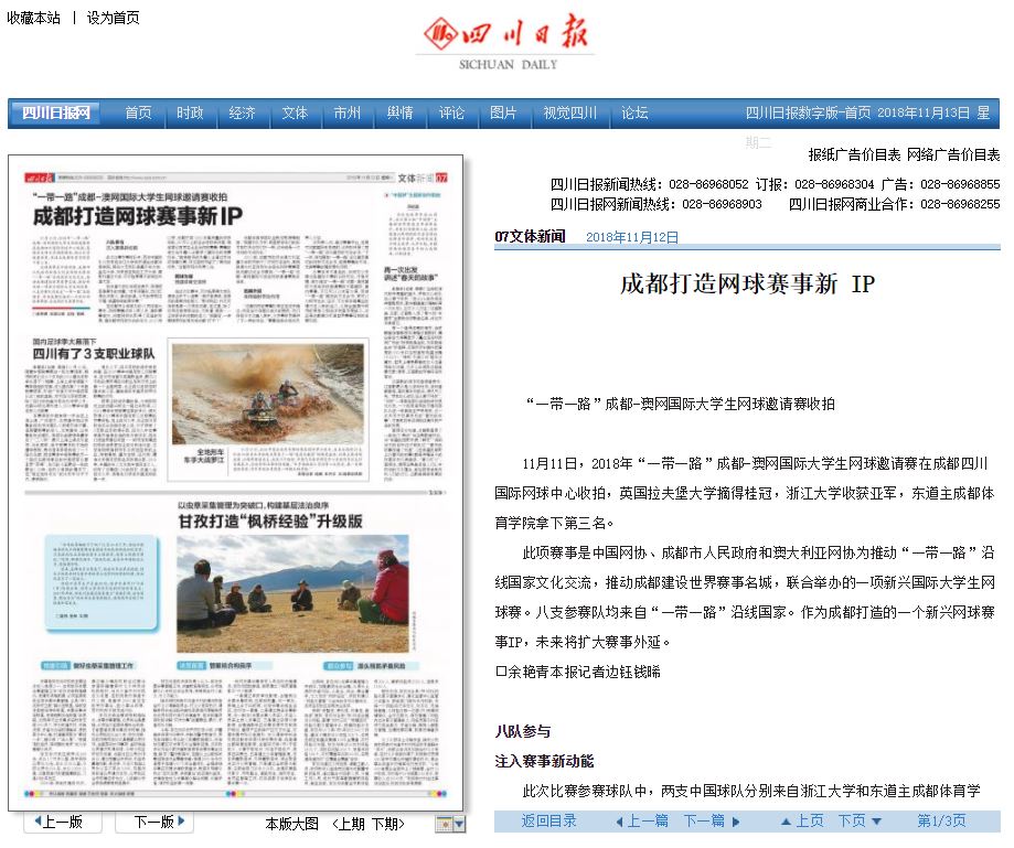 2017年,成都市政府與澳大利亞墨爾本政府進行了訪問交流活動,其間就澳大利亞網(wǎng)球協(xié)會相關(guān)網(wǎng)球賽事落地成都達成合作意向,“一帶一路”成都-澳網(wǎng)國際大學(xué)生網(wǎng)球邀請賽就此誕生。