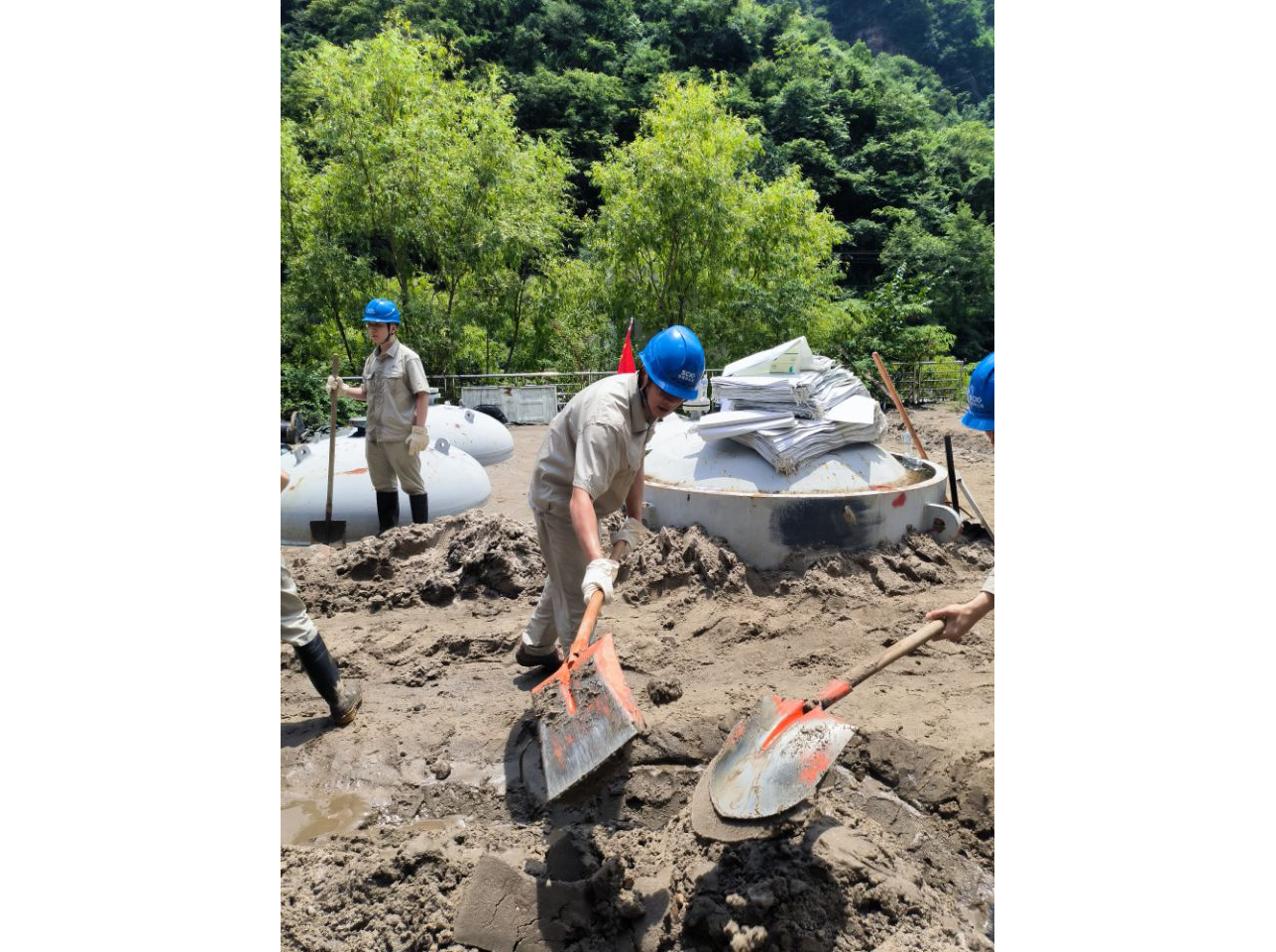 “戰(zhàn)疫保電”的同時(shí),田灣河公司還經(jīng)歷了一次抗險(xiǎn)救災(zāi)考驗(yàn)。8月底,一場(chǎng)大雨裹挾著2萬(wàn)余方泥石流沖毀了田灣河生產(chǎn)現(xiàn)場(chǎng)通往仁宗海電站的道路與主要線路。為確保安全發(fā)電,基地所有部門(mén)悉數(shù)出動(dòng),“白 黑”連續(xù)奮戰(zhàn)搶險(xiǎn)自救。泥濘的滑坡體里,黨員沖鋒在前排查隱患;傾倒的電線桿旁,青年志愿者逐一排查受損情況;被泥水淹沒(méi)的庫(kù)房里,黨員突擊隊(duì)全力清淤;廠房里、大壩旁,身處交通孤島的黨員職工們沉著冷靜堅(jiān)持工作。