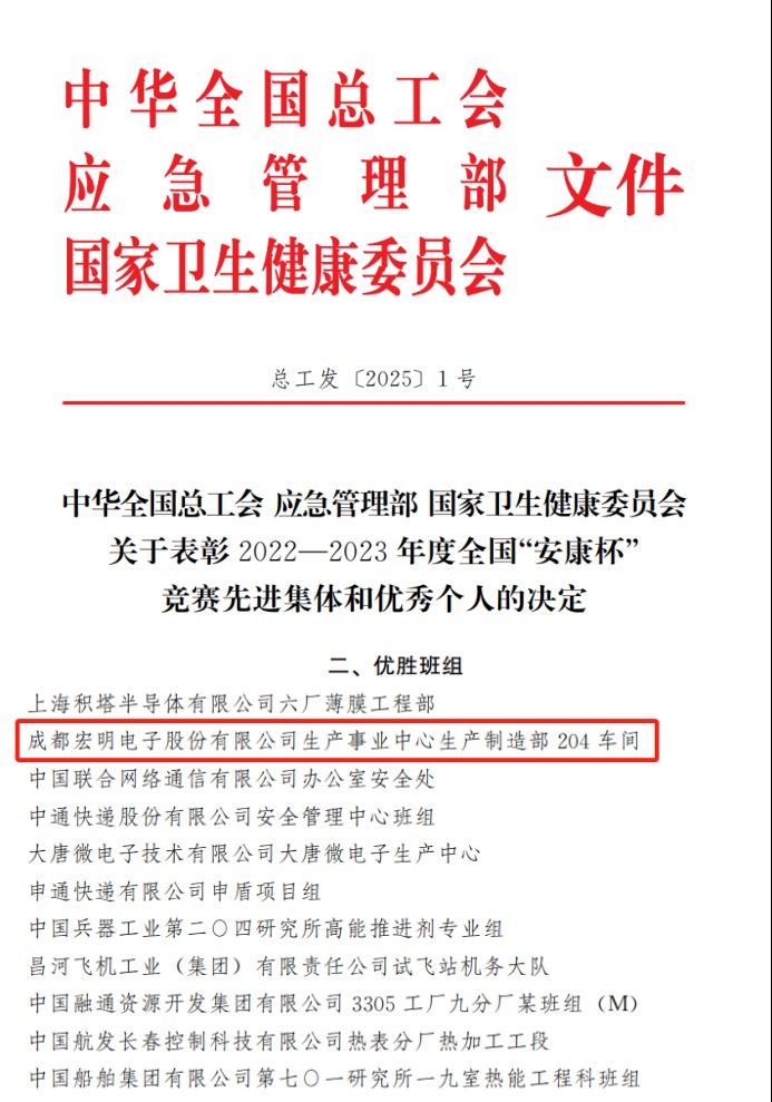 近日,中華全國(guó)總工會(huì)、應(yīng)急管理部、國(guó)家衛(wèi)生健康委員會(huì)聯(lián)合發(fā)布了《關(guān)于表彰2022-2023年度全國(guó)“安康杯”競(jìng)賽先進(jìn)集體和優(yōu)秀個(gè)人的決定》,川投信產(chǎn)所屬宏明電子生產(chǎn)事業(yè)中心生產(chǎn)制造部204車(chē)間榜上有名!