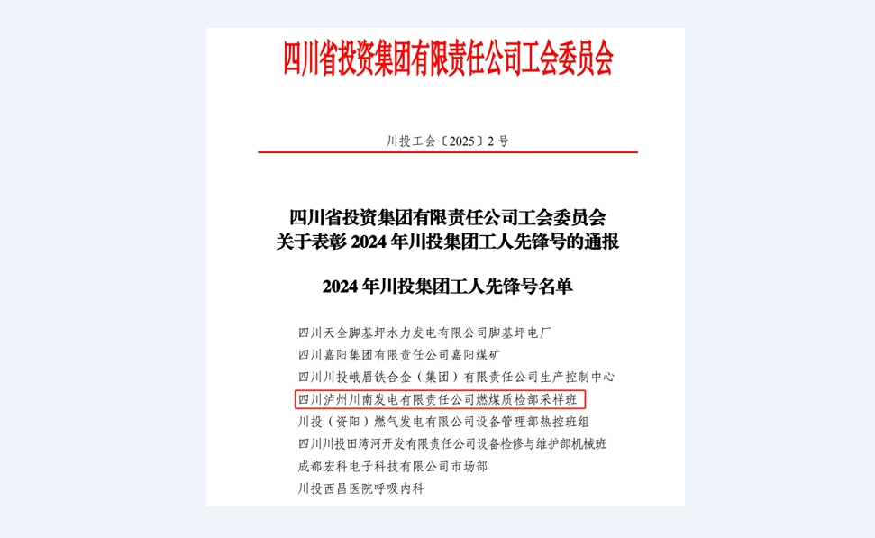 近日,川投集團(tuán)工會(huì)印發(fā)了關(guān)于表彰2024年川投集團(tuán)工人先鋒號(hào)的通報(bào),川南發(fā)電公司燃煤質(zhì)檢部采樣班獲評(píng)“2024年川投集團(tuán)工人先鋒號(hào)”榮譽(yù)稱號(hào)。