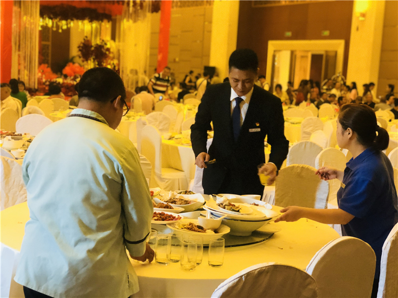 上午11點,12名支援服務(wù)隊員在川投國際酒店蜀韻廳集合,進行支援工作前的培訓(xùn)并安排分工。午宴開始后,支援服務(wù)隊員按照各自的分工,與餐娛部同事共同完成了傳菜、上菜、看臺、收餐等工作,圓滿完成當(dāng)天所有接待任務(wù)。