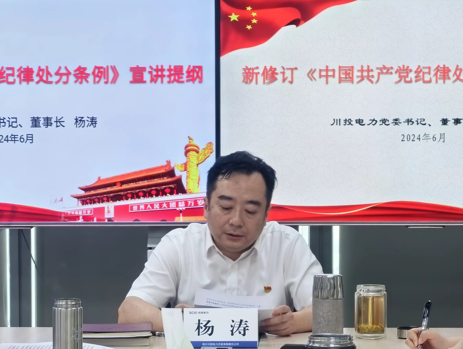 為深入貫徹落實(shí)習(xí)近平總書記關(guān)于黨的自我革命的重要思想,引導(dǎo)黨員干部職工增強(qiáng)紀(jì)律意識(shí),強(qiáng)化思想武裝,提升黨紀(jì)學(xué)習(xí)教育成效,按照川投電力黨委關(guān)于開(kāi)展黨紀(jì)學(xué)習(xí)教育的工作安排,6月24日上午,川投電力黨委書記、董事長(zhǎng)楊濤講授黨紀(jì)學(xué)習(xí)教育紀(jì)律黨課。川投電力黨委委員、紀(jì)委書記謝麗主持會(huì)議。