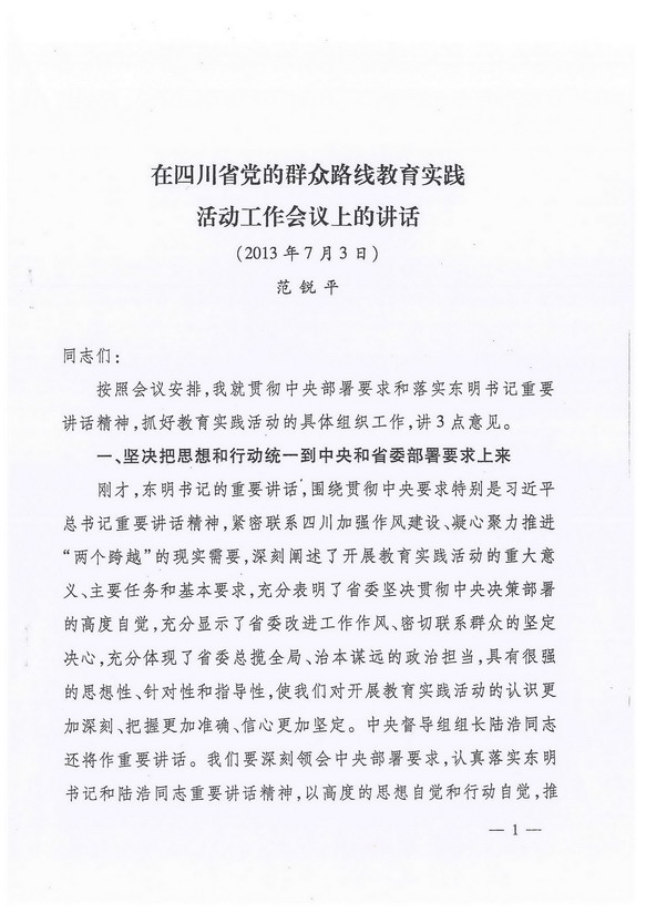 在四川省黨的群眾路線教育實(shí)踐活動工作會議上的講話(范銳平)